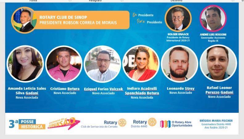 O Distrito 4440 realizou a sua 3ª posse histórica virtual na Cidade de Sorriso, e o Rotary Club de Sinop ganhou mais 6 companheiros. São eles, Amanda Letícia Sales Silva Gadani, Cristiano Botura, Ezequiel Farias Valczak, Indiara Acadrolli Sponchiado Botura, Leonardo Strey e Rafael Leonor Peruzzo Gadani.