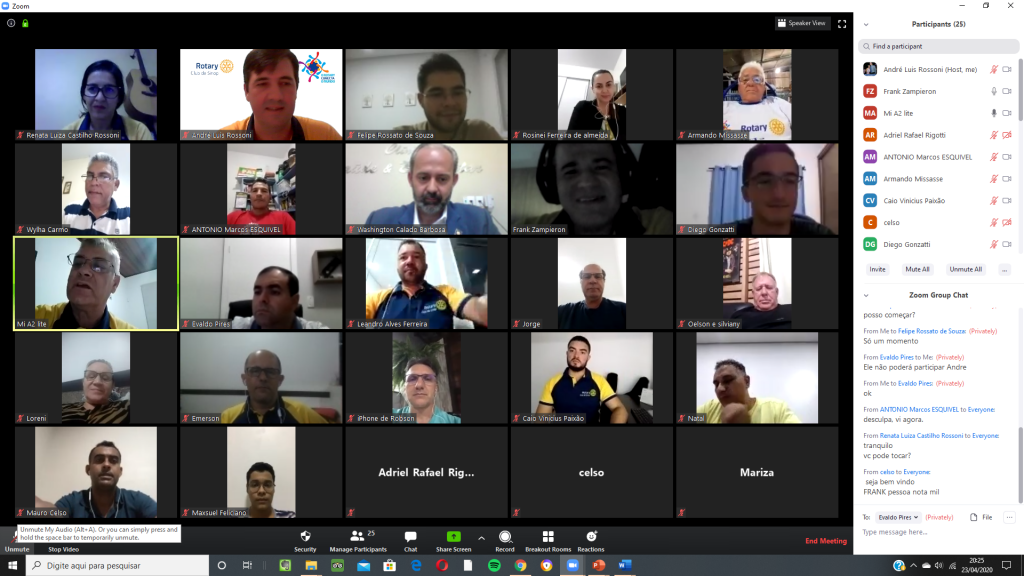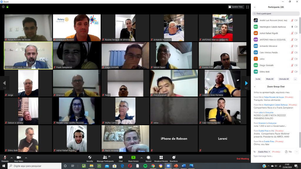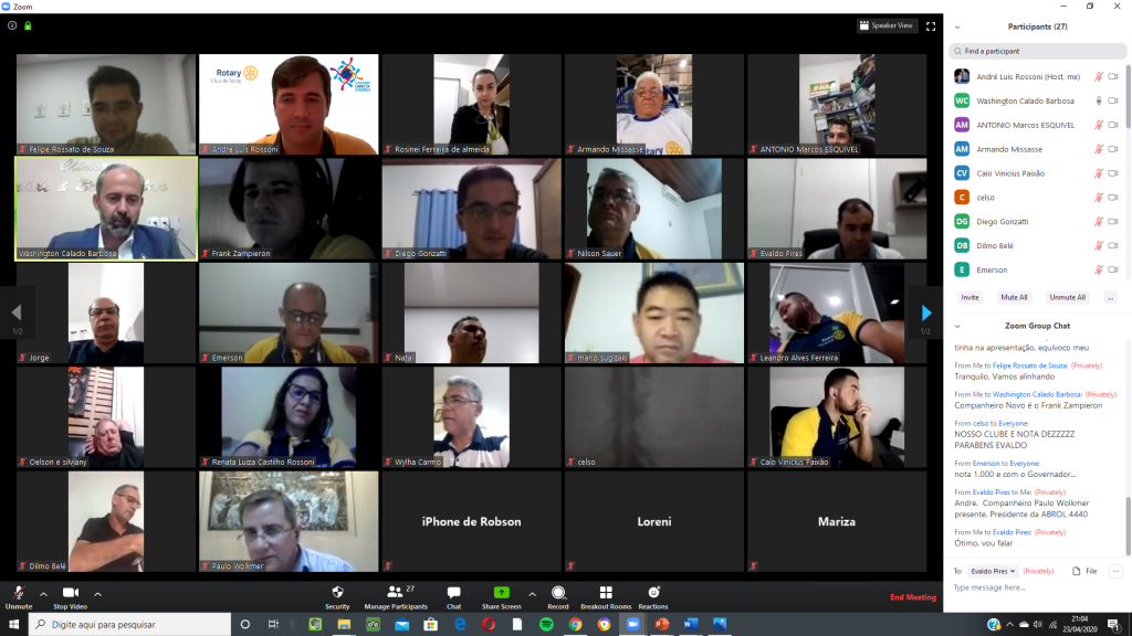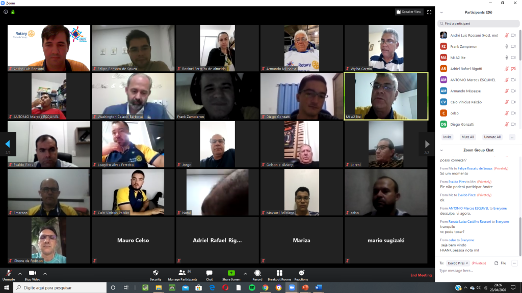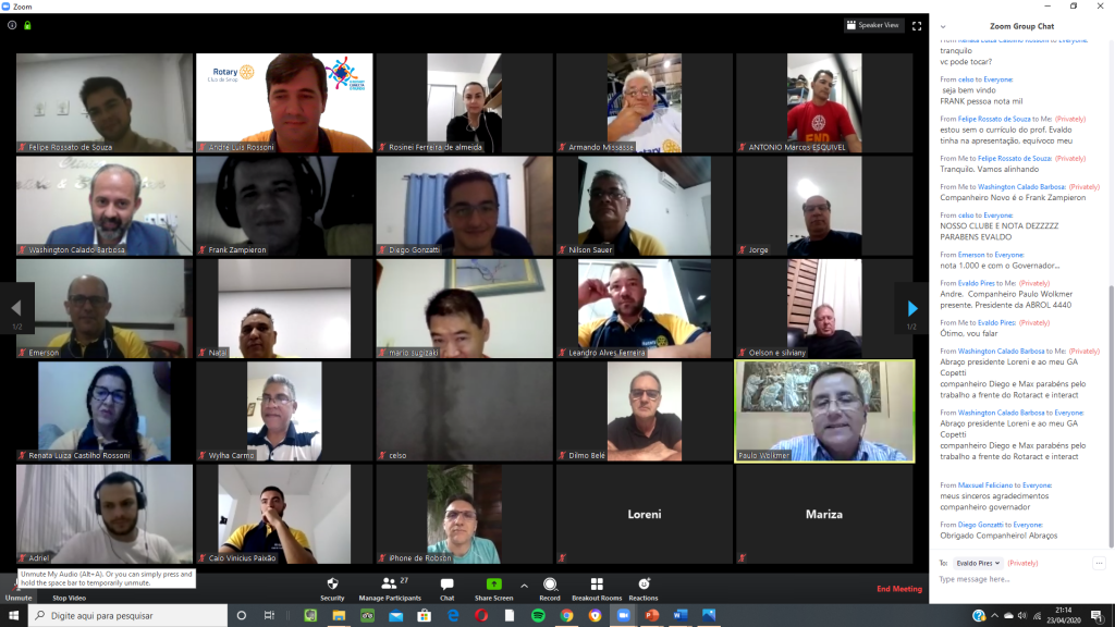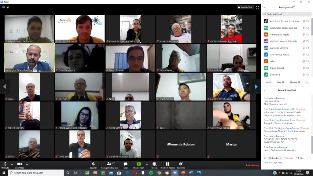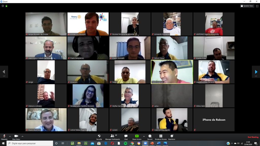 Nesta quinta feira, 23/04/2020, o Rotary Club de Sinop realizou reunião por videoconferência para comemorar seus 38 anos de fundação (12/04/1982). A reunião contou com a presença, além da maioria dos companheiros do clube, de diversas autoridades rotárias, entre elas o governador do Distrito 4.440, Washington Calado Barbosa; os governadores assistentes das regiões IX e X, Mario Mateus Sugizaki e Oelson Copetti, os presidentes do Rotary Club de Sinop Tarumã, Wylham do Carmo, do Rotary Club de Sinop Teles Pires, Loreni Pedroso, do Rotary Club de Lucas do Rio Verde, Silviany Carvalho, do Rotaract Club de Sinop São Cristóvão, Diego Gonzatti, do Interact Club de Sinop, Maxsuel Feliciano de Jesus, e da Academia Brasileira Rotária de Letras, seção MT, Paulo Wolkmer.