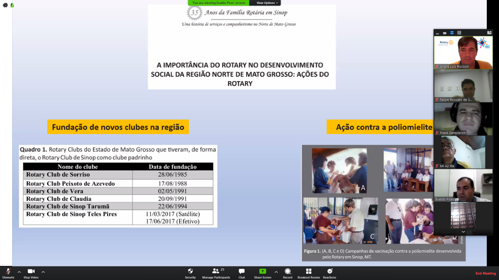 E para brindarmos a noite juntamente a todos os companheiros que estavam conectados na sala de videoconferência, tivemos uma belíssima palestra sobre a história e os principais feitos do Rotary em Sinop, proferida pelo Prof Evaldo Martins Pires, autor, juntamente com a companheira Roberta Martins Nogueira e o companheiro Jorge Luiz Caetano de Cursi, do livro "35 anos da família rotária em Sinop".