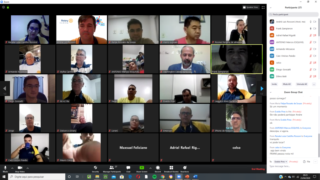 A reunião, realizada por videoconferência devido a atual pandemia de COVID19, contou com um início diferente, tendo em vista que foi realizada a primeira admissão de associado do Rotary Club de Sinop a distância. O companheiro Frank Zampieron, que já foi rotariano deste clube em período anterior, retorna para continuar a servir a sociedade. Sua classificação é odontologia e o companheiro servirá, neste ano rotário, na comissão de projetos humanitários, presidida pelo seu padrinho Nilson Sauer.