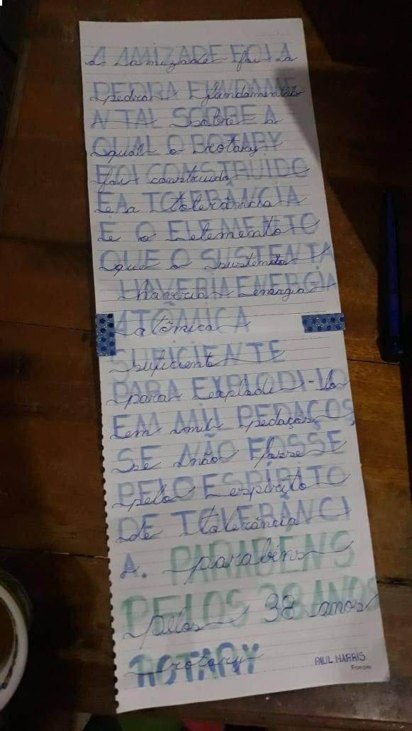 Diversos outros companheiros também falaram sobre esta data especial e da importância do Rotary para a região e o mundo, sendo que no meio da reunião recebemos uma carta especial da filha do companheiro Emerson Lopes, Bruna, a qual expressou de forma emocionante a sua alegria com o aniversário do Rotary Club de Sinop.